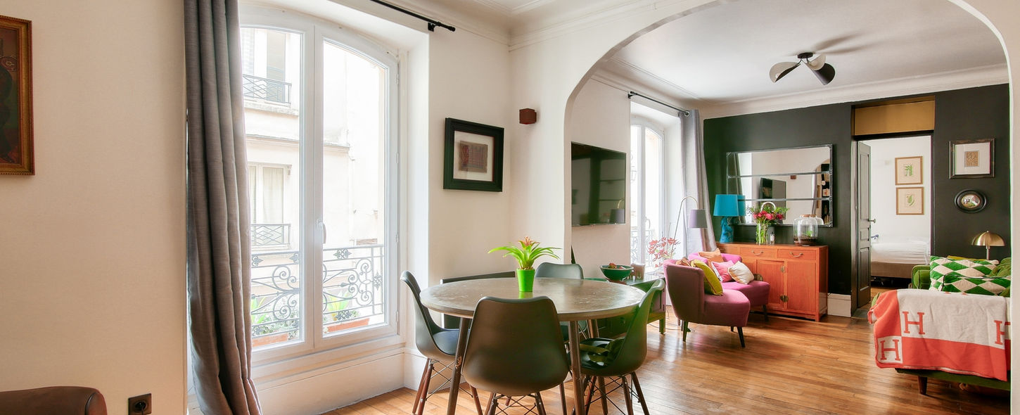 Set within a classic Parisian building, this apartment offers a warm and inviting atmosphere with a well-designed living space.